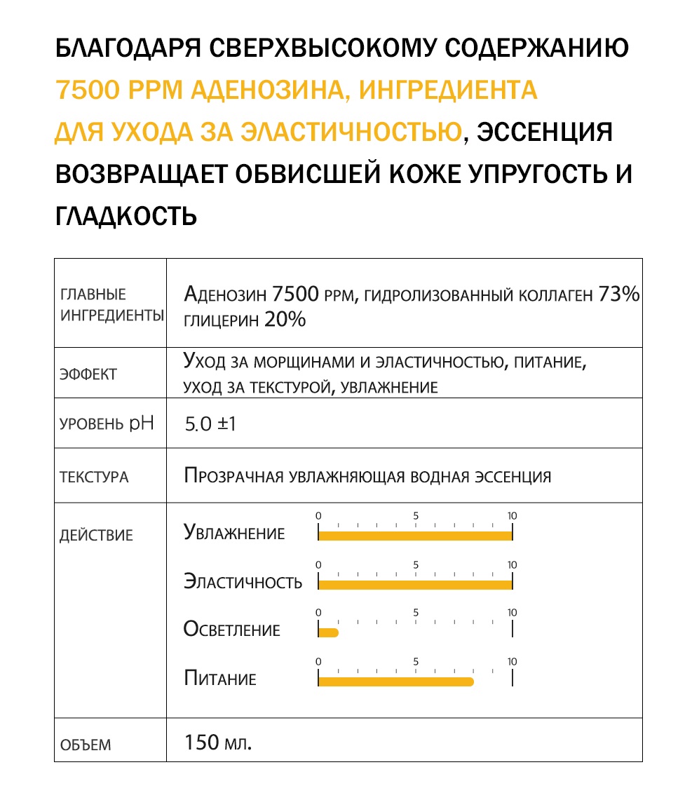 Эссенция для ухода за эластичностью, со сверхвысоким содержанием аденозина 7500 ppm, подходит коже, утратившей тонус, эффективно разглаживает и возвращает эластичность коже, делает ее упругой и ровной. Прозрачная увлажняющая водная эссенция мгновенно улучшает состояние сухих мест за счет наполнения кожи влагой. В результате применения текстура кожи разглажена без ощущения липкости.