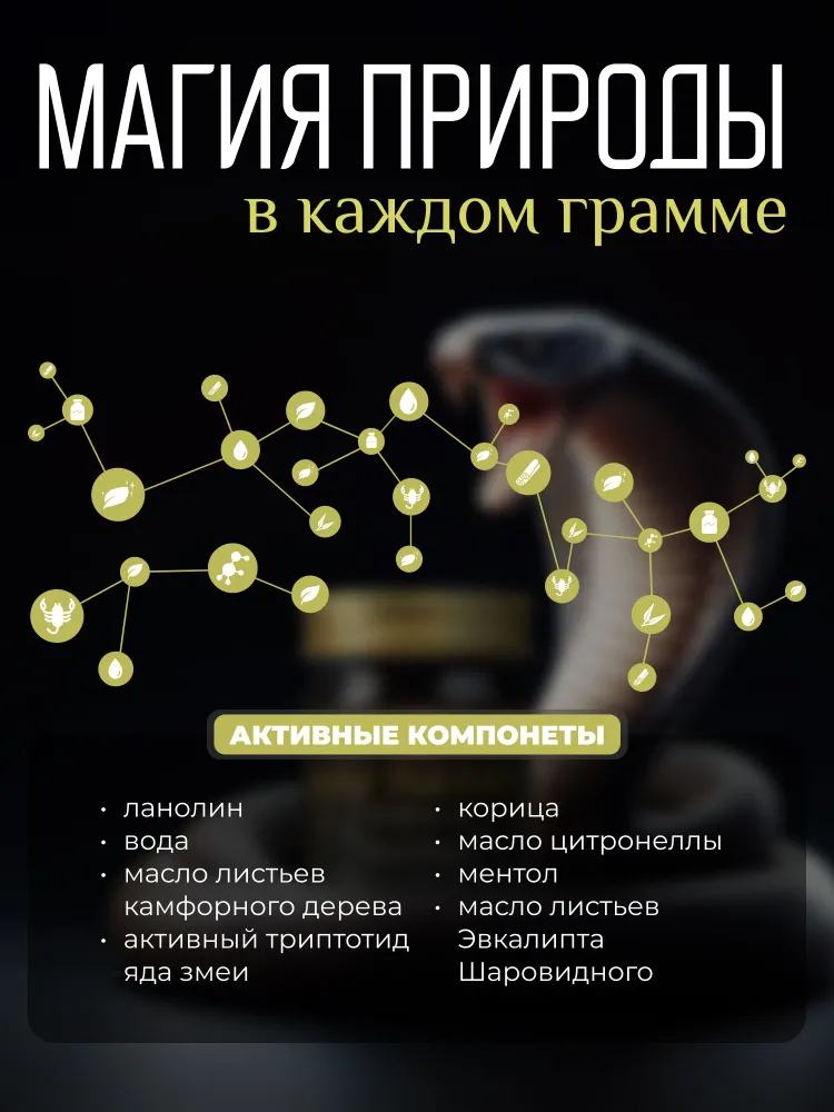 Покупая у нас, вы делаете выбор в пользу натурального продукта с проверенными временем свойствами. Попробуйте тайскую мазь с ядом черной кобры от Banna уже сегодня!