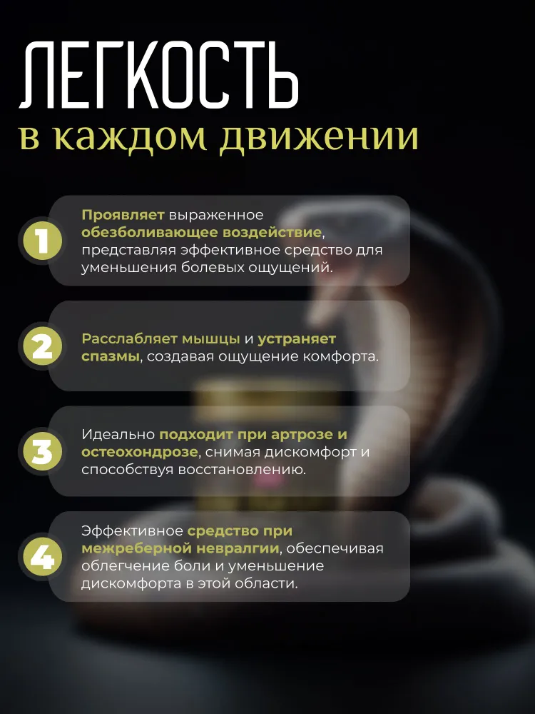 Благодаря своей универсальности, жидкий бальзам кобры подходит как для спортсменов, так и для людей, ведущих малоподвижный образ жизни или испытывающих дискомфорт из-за физических нагрузок.